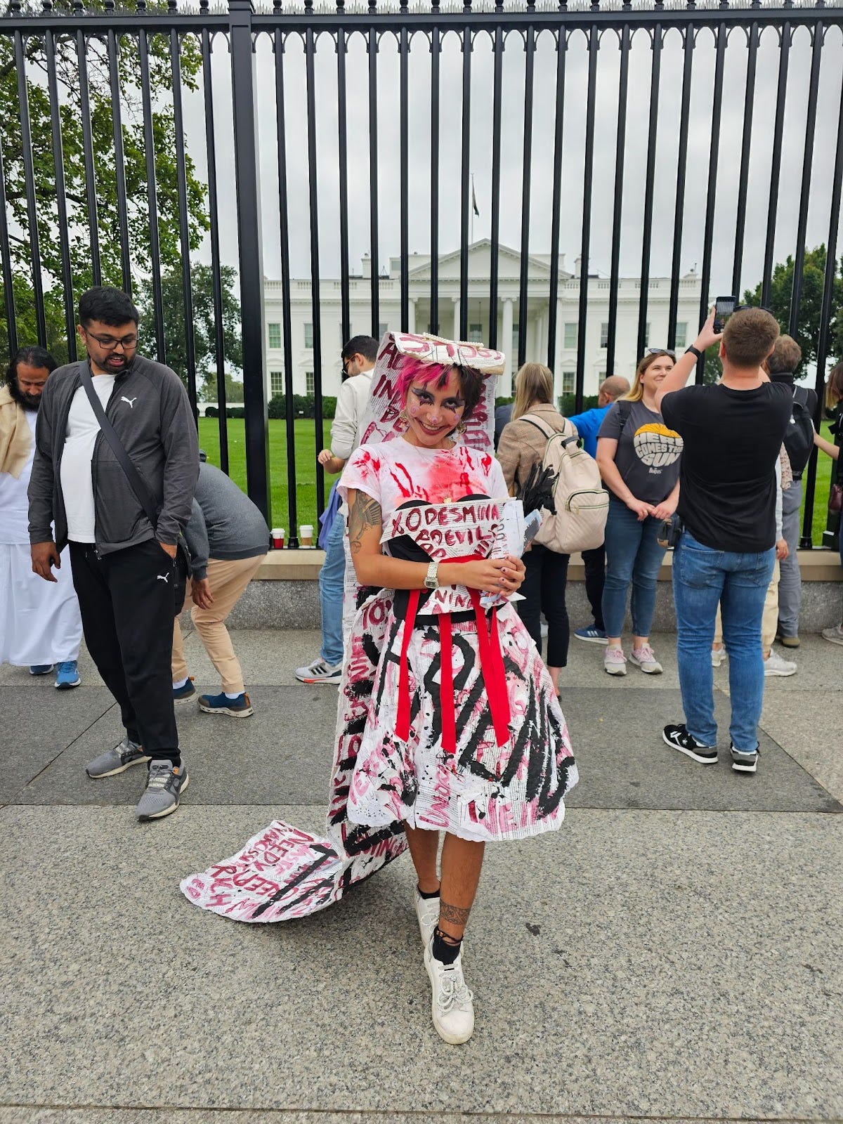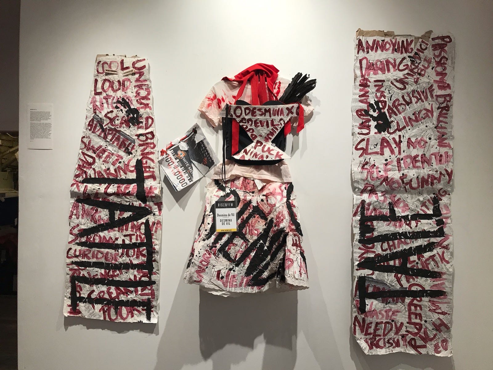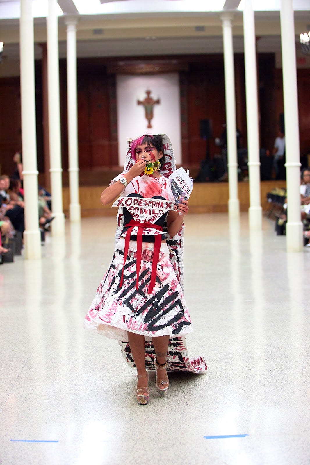 "Old Friends" is the final design shown at the Desmina de Vil New York Fashion Week Fall 2023 debut. It is created from paper mache, recycled clothes, and paint. Each piece of paper contains adjectives from the inner voice- words of judgement and self-hate, and words of self-affirmation and love. This dress acknowledges that the inner demons that haunt us don't need to be our enemies. While voices of shame may never disappear, they can become quieter Old Friends, jesters who teach us important lessons, the dark compliment to our angels. As the last matrimonial look of the collection, this dress represents the decision to marry oneself for eternity, through the blood and pain of life, death, and birth, despite perceived flaws and downfalls. It is the visual creation of the "Tattle Tale", Desmina de Vil's satirical gossip column and literary fashion magazine. The pieces of paper are evidence for a case of discrimination at the artist's former workplace.