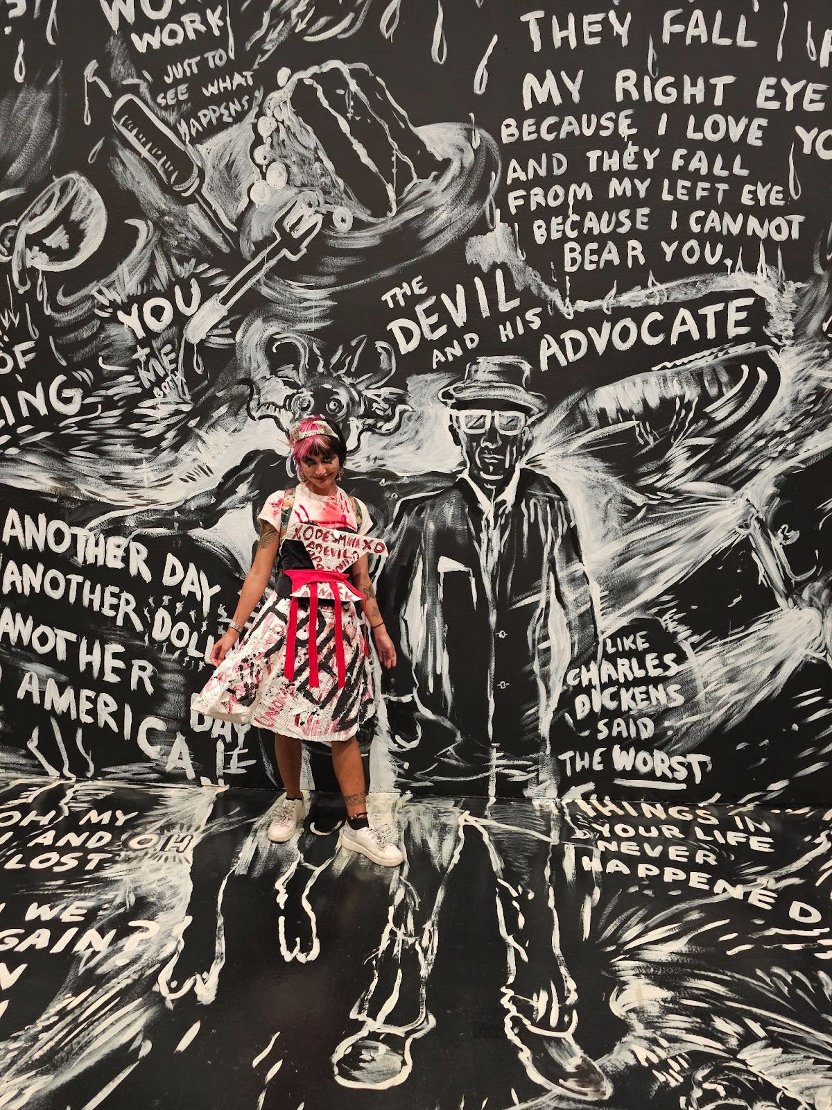 Desmina de Vil is a self proclaimed Clown, who weaves universal and personal stories of life and death through multiple art mediums. A writer, orator, and artist, Desmina uses humor and satire to celebrate the Dark and Gory parts of existence. Ms. de Vil is a fully realized human meme, a larger than life story book character of pure ego that performs on the stage of reality. The literal representation of the Shadow Self, Desmina's art plays with the eternal imagination of the archetypes.