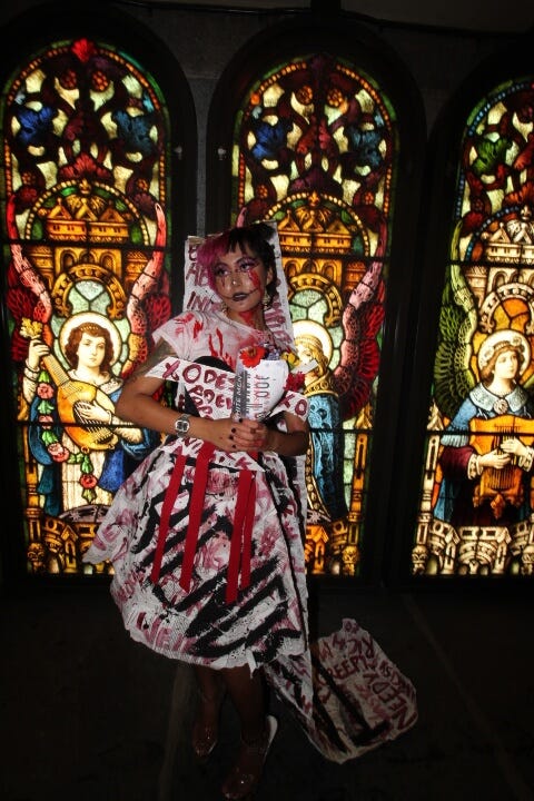 I’m dead. I have died a glorious death and now I stand here in a chapel in a blood stained wedding dress, dripping with all my faces and names.