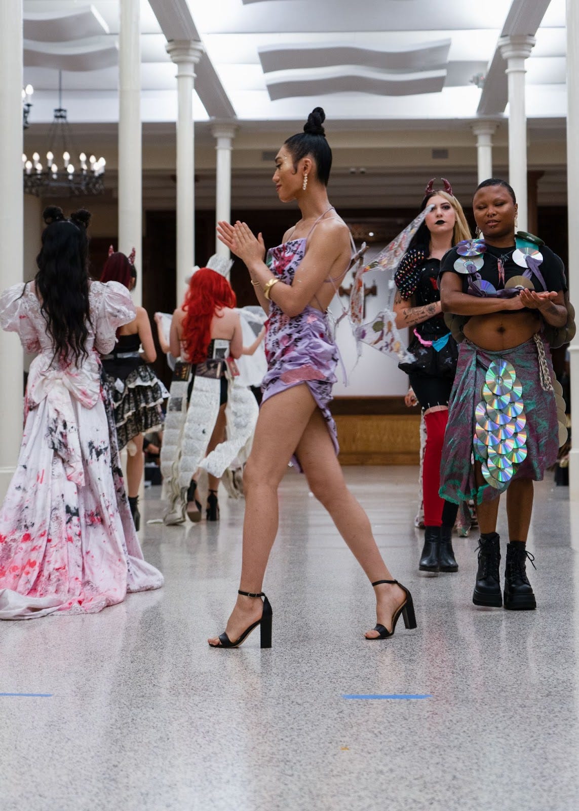 I nearly squealed when I walked up to the venue this morning, dragging luggages full of trash clad outfits. My fabulous and daring wedding party was certainly making an impression, quite colorful among the throngs of tall models in drab black skin tight tops and leggings, waiting on the words of the designers.